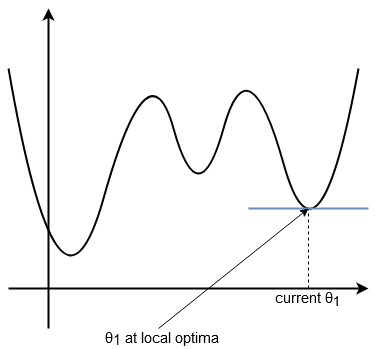 parameter가 이미 local optima에 있다면 미분계수가 0이 되므로 gradient descent는 parameter에 아무 영향이 없다.