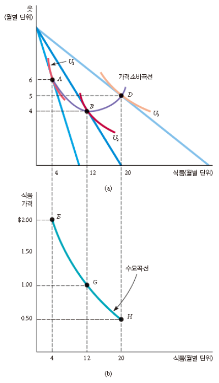 (a)에서 다양한 식품 가격에 대응하는 효용 극대화를 달성하는 점(예산선과 무차별곡선의 접점)을 이으면