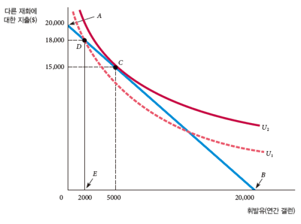 원래대로면 5000갤런 쓸 건데(점 $C$) 배급제로 인해(휘발유 소비가 2000갤런으로 제한되어) $D$ 점으로 이동함