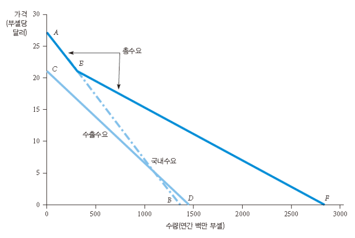 밀의 세계총수요는 국내수요($\overline{AB}$)와 수출수요($\overline{CD}$)의 수평합