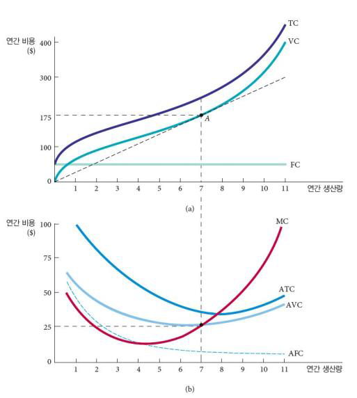 평균비용은 원점과 그 점의 기울기고, 한계비용은 변동비용곡선의 그 점에서의 접선의 기울기
