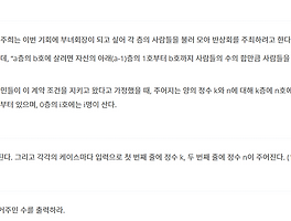 [BAEKJOON] 2775번 각 아파트에 사는 사람을 표로 표현하면 다음과 같다. 1 16 136 … 1 15 120 1 14 105 1 13 91 1 12 78 1 11 66 1 10 55 1 9 45 1 8 36 1 7 28 1 6 21 1 5 15 1 4 10 20 35 56 81 107 152 207 273 351 442 547 1 3 6 10 15 21 28 36 45 55 66 78 91 105 1 2 3 4 5 6 7 8 9 10 11 12 13 14 첫번째 열을 제외하고 대각선 대칭이다. 3-34-6-45-10-10-56-15-20-15-67-21-35-35-21-7... 따라서 n행 n열의 값은 n-1행 n열과 n행n-1열의 값의 합이다. 1234567891011121314151617181920212223242526..